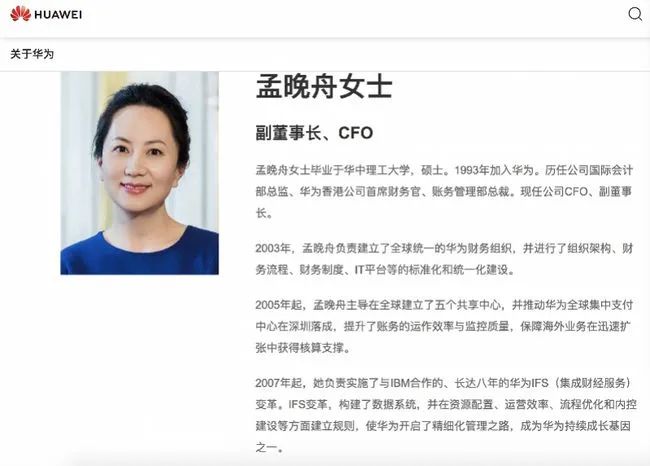 華為官網(wǎng)顯示,孟晚舟目前仍擔(dān)任公司副董事長、CFO一職。