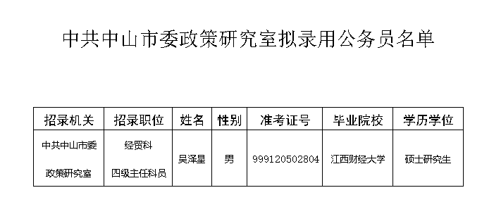 根據《中華人民共和國公務員法》、《公務員錄用規定》、《廣東省公務員錄用辦法》等有關規定,按照《廣東省2021年考試錄用公務員工作實施方案》要求,經筆試、面試、體檢和考察等程序,擬錄用吳澤星同志為我室公務員(名單附后)。