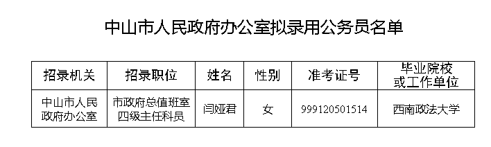 根據《中華人民共和國公務員法》《公務員錄用規定》《廣東省公務員錄用辦法》等有關規定,按照《廣東省2021年考試錄用公務員工作實施方案》要求,經筆試、面試、體檢和考察等程序,擬錄用閆婭君同志為我辦公務員(情況附后)。