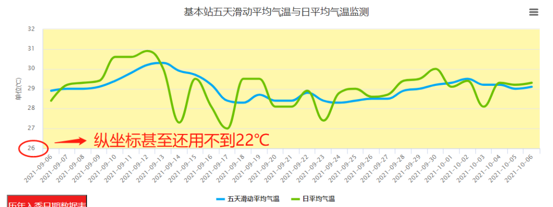 按照氣候學標準,當五天滑動平均氣溫≤22℃時才算入秋,并且以滿足條件的五天中首個日平均氣溫≤22℃那天作為入秋日。